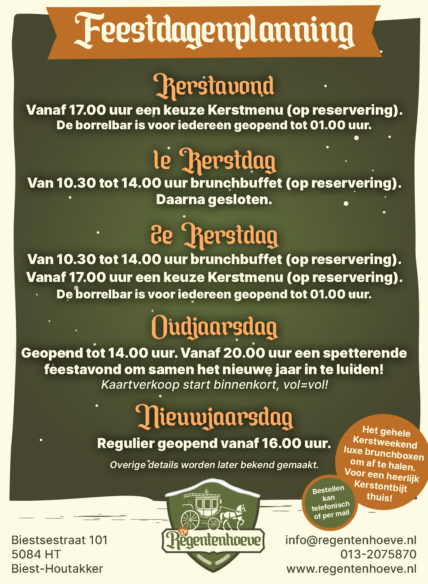 Bij de brug van Biest-Houtakker vindt u De Regentenhoeve, een sfeervolle plek waar iedereen zich thuis voelt. Sinds februari 2025 hebben wij onze deuren geopend voor jong en oud. Kom gezellig langs voor een gezellige lunch, een smakelijk diner, een borrel of gewoon een kopje koffie.